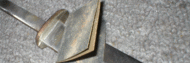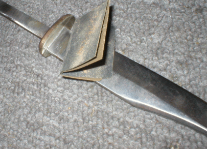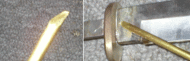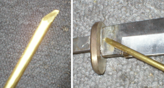 Find a scrap piece of brass rod and grinf a chisel tip on it as shown. Use this to gently scrape the solder down flush to the surface od the blade and guard. Go slow. The brass is harder that the solder and softer than the blade but could still scratch you guard. | |
