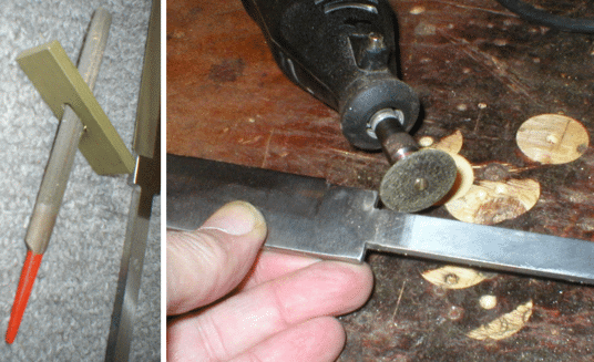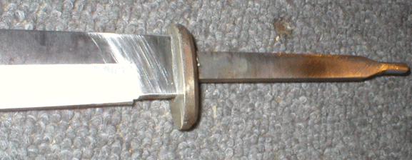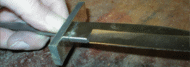 Make sure the guard fits tight and snug. Don't plan on using the solder to fill large gaps or you'll end up with a very weak joint. Use a file to get a final fit on the guard slot and a Dremel with fiberglass cutting disk to square up the inside shoulders of the tang. Test fit often The slots on the machined guards are just a hair undersized to allow you to do a final fitting. | |