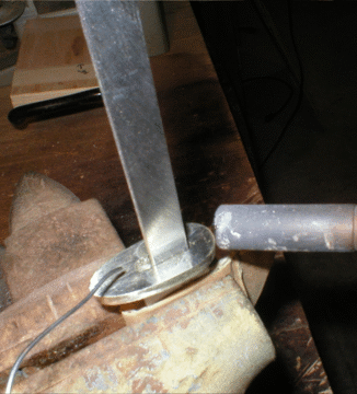 I wrap the blade in cardboard to keep the vice from marring the blade while being clamped. A lot of people like to solder from the front but I like working from the back, hence the downward facing blade. Stay Brite comes with an excellent liquid flux which, when heated, cleans and etches the surface lightly, helping the solder stick all that much better. Apply sparingly. | |