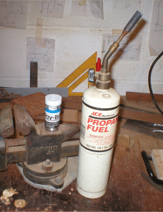Basic supplies: a propane torch ( you don't need one of those fancy ones), a vice to hold the knife during soldering, ( as if I don't have enough vices), and the star of the show: Stay Brite solder. You're going to find that a good solder like Stay Brite will make your life a whole lot easier. | |