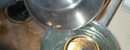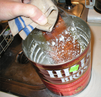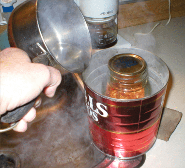 Pour boiling water in the coffee can to surround the jar. The object here is to safely heat the wood hardener in the jar. By the way, please make sure the area is very well ventilated. The smell is very strong enough to strip wallpaper and will assuredly lower your IQ by a few points if inhaled for a long time. Outside is best, by an open window is a second choice. | |