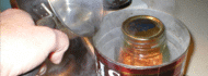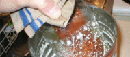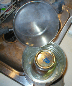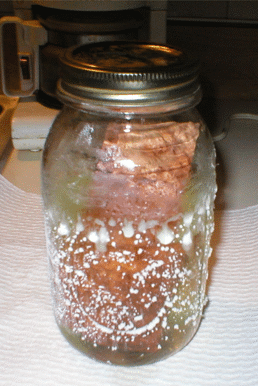 Remove the jar and screw that lid down tightly. Remember your high school physics class? As the closed jar cools off, a vacuum will be created inside which will draw the wood hardener into those newly opened pores. Let it cool off slowly and keep the jar sealed for a week or so. The white stuff on the side of the jar is some of the wood hardener that foamed over the lip. | |