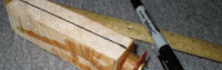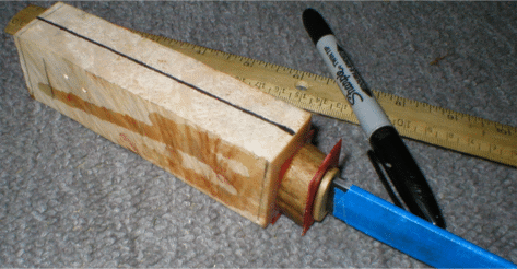 I didn't trust the tang hole I drilled to be 100% straight, so I drew a new reference center line on the handle using a ruler placed parallel to the blade itself. I was right. The drilled hole was slightly off. | ||||