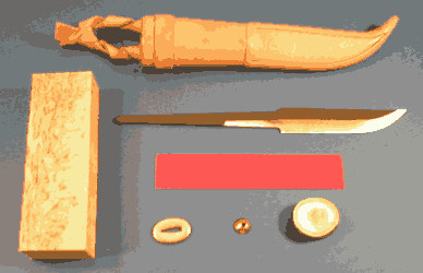 Here's what comes in the kit. I like the blade. This is a good, useful size and the quality is very nice. The unfinished sheath is very nice, too but I don't have a clue what that little rivet is for. I've never worked with honest-to-goodness real horn before so this spacer should be interesting. | ||||