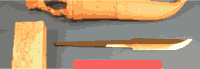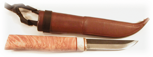 The Finnish Puukko is a design that goes back 1000 years and was designed by a people used to living in a harsh and challenging environment. Today, the puukko is an everyday knife that is used for everything from hunting, fishing and garden work to opening boxes in the warehouse. Traditionally the handle is made of birch ( Please note that this construction article features a birch burl handle whereas the kits are now shipping with a curly birch. Curl or burl, I like them both, but it makes a difference to some folks ) with horn spacers for decoration. ( To purchase the Puukka Kit, please see Blades, Page 4 ) |