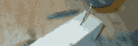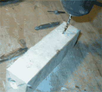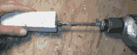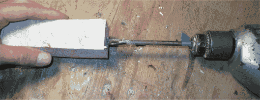 Rather than splitting the block like I did for the hidden tang project, I'm just going to drill a tang hole with a 3/8" spade bit. The piece of blue tape tells me when I've drilled deep enough. Go slow , constantly checking that you're drilling straight. | ||||
