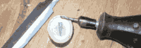 I'm going to use a fine carbide burr bit to cut the tang clearance hole in the horn spacer . I traced the clearance hole from the brass guard to act as a guide. | ||||
