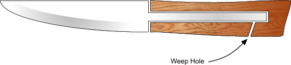 You'll also need to drill a 1/16" "weep" hole to allow the excess epoxy and air bubbles to escape. This should intersect the tang hole you just drilled. | ||||